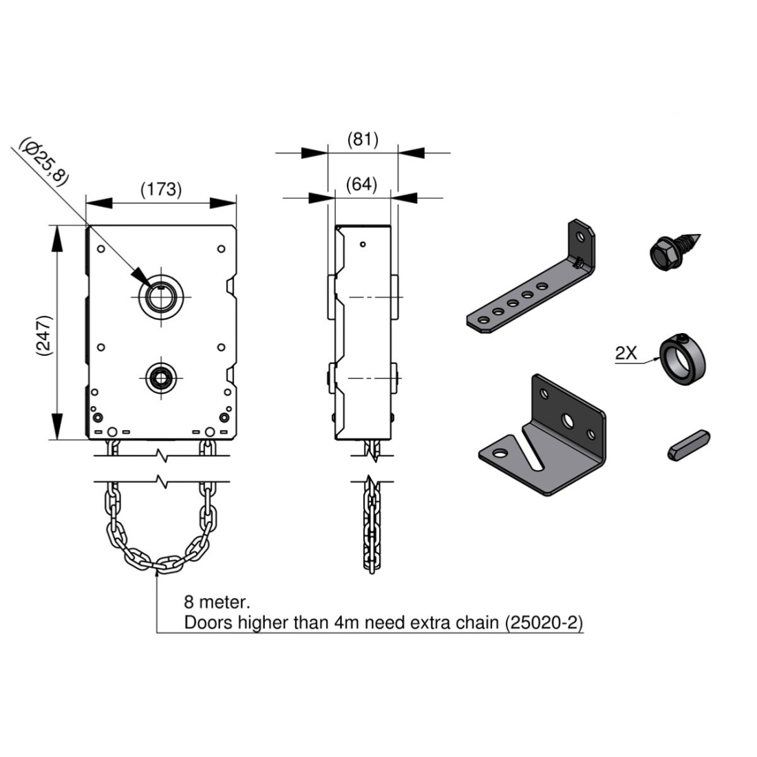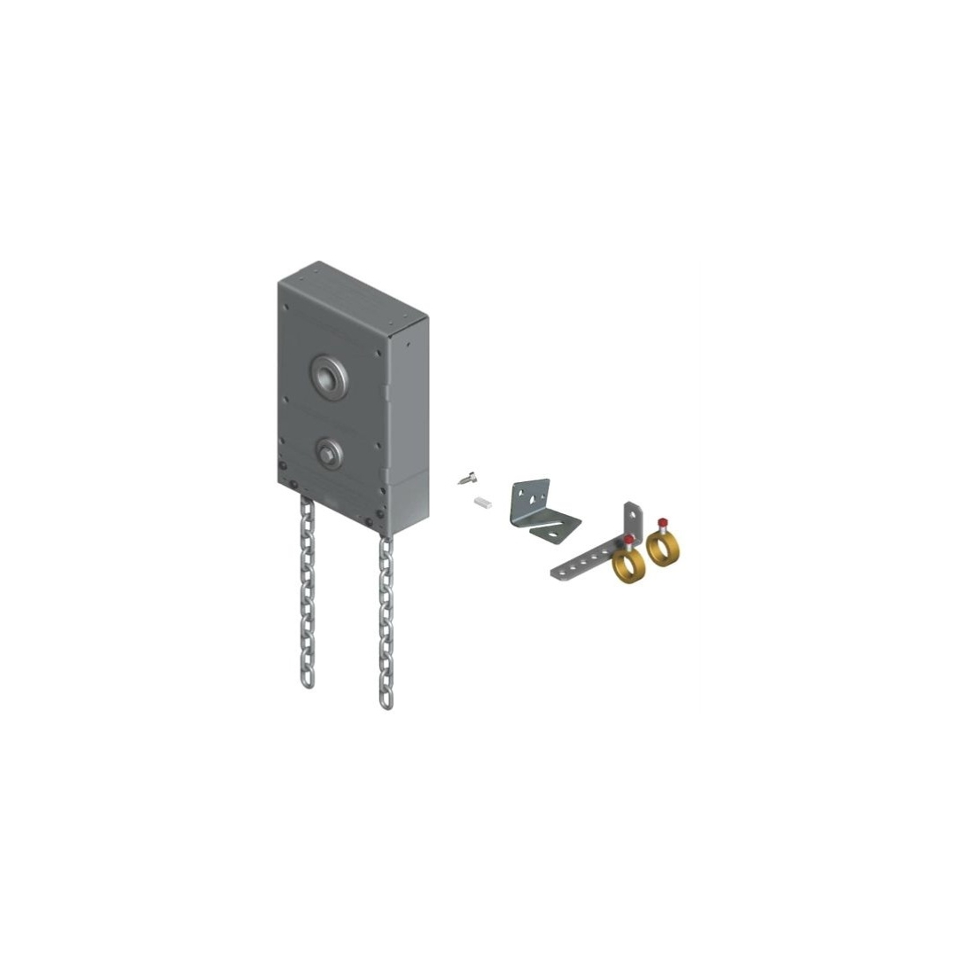Le treuil à chaîne se fixe directement sur l’arbre de la porte sectionnelle, en complément des ressorts de torsion. Il est conçu pour une installation rapide par un professionnel, sans câblage électrique. La chaîne permet une transmission de force progressive, assurant une montée fluide et une descente contrôlée de la porte.