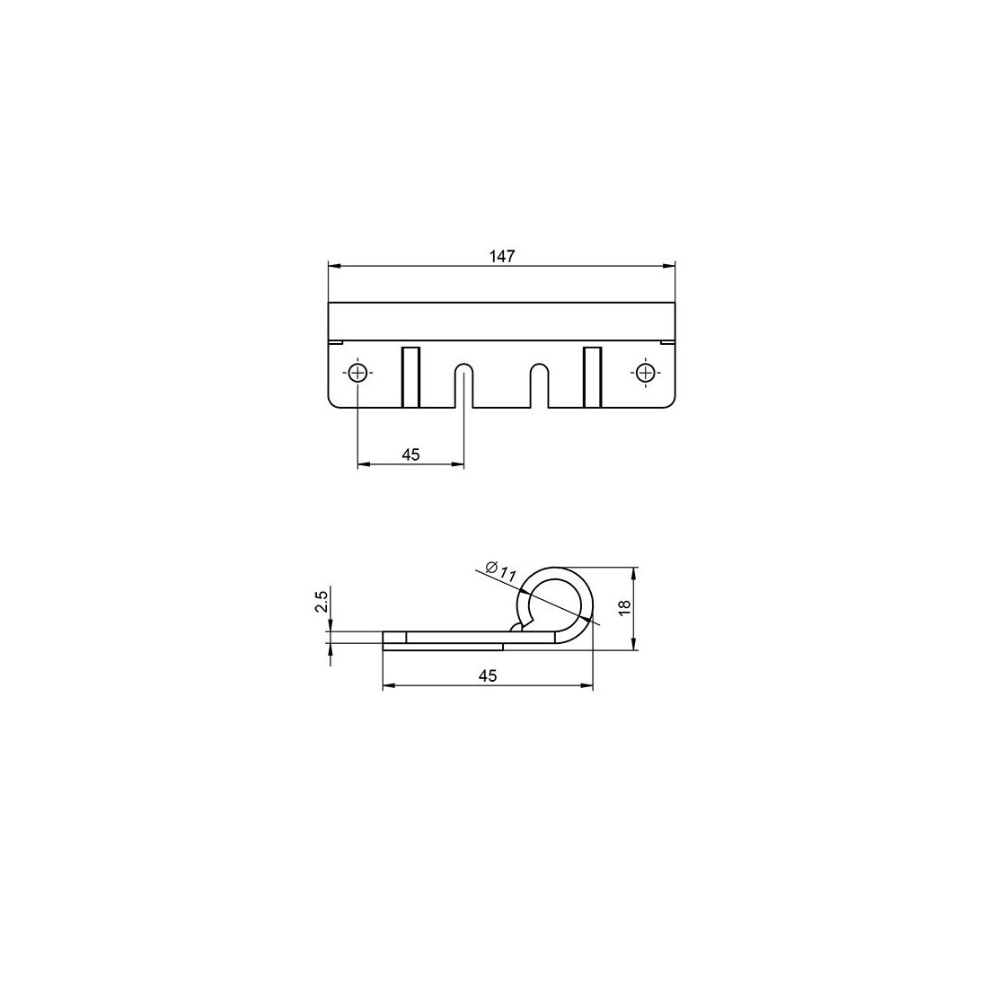Support de roulette double. Dim : 147x45mm, épaisseur 2,5mm. Conçu pour tiges Ø11mm. Idéal pour galet long.
